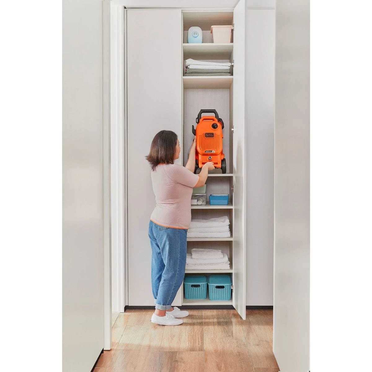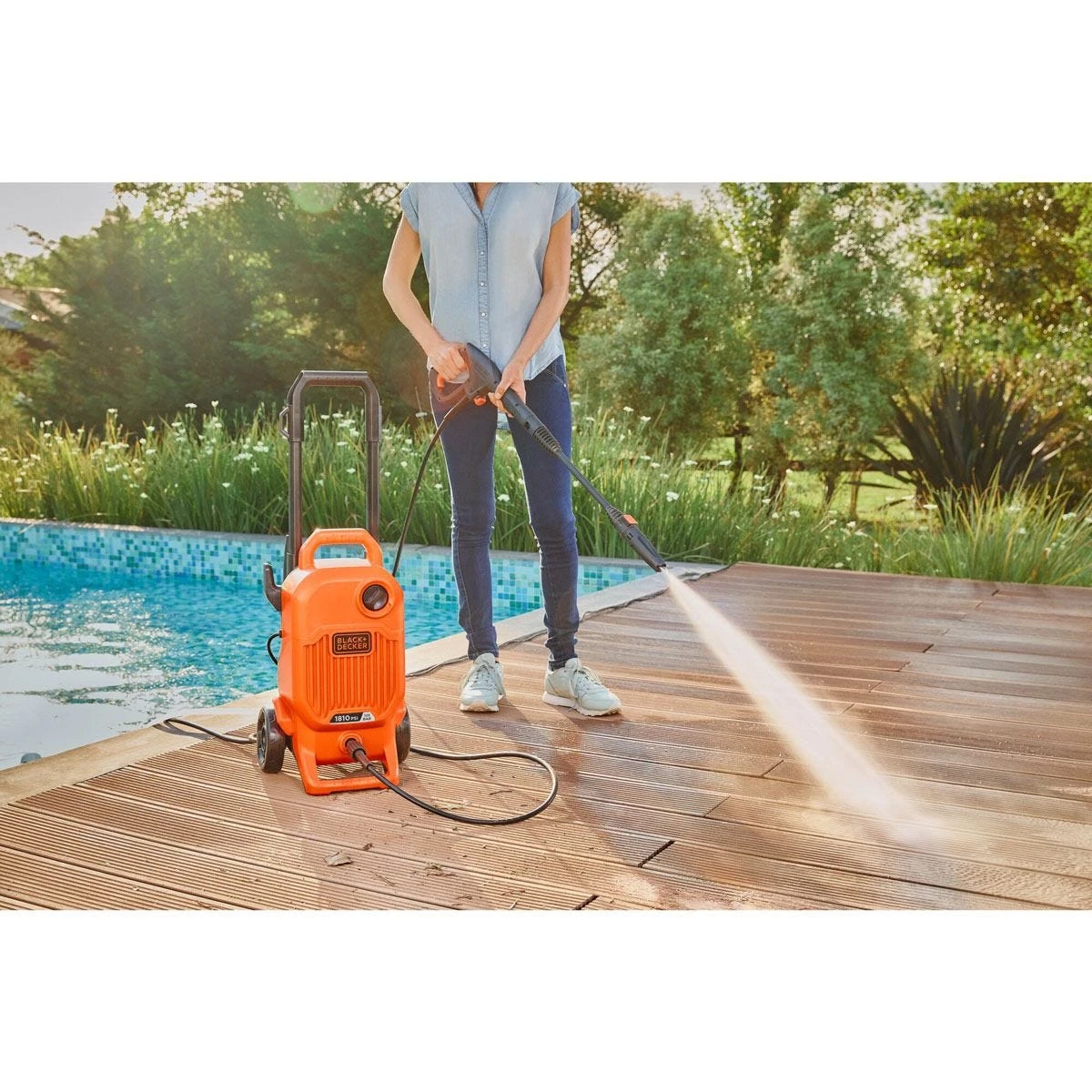 Black+Decker BEPW1700 is a lightweight self-priming pressure washer with a powerful 1700w motor providing 125 Bar/1810PSI of water pressure. With eight accessories, wheels, and a long handle.