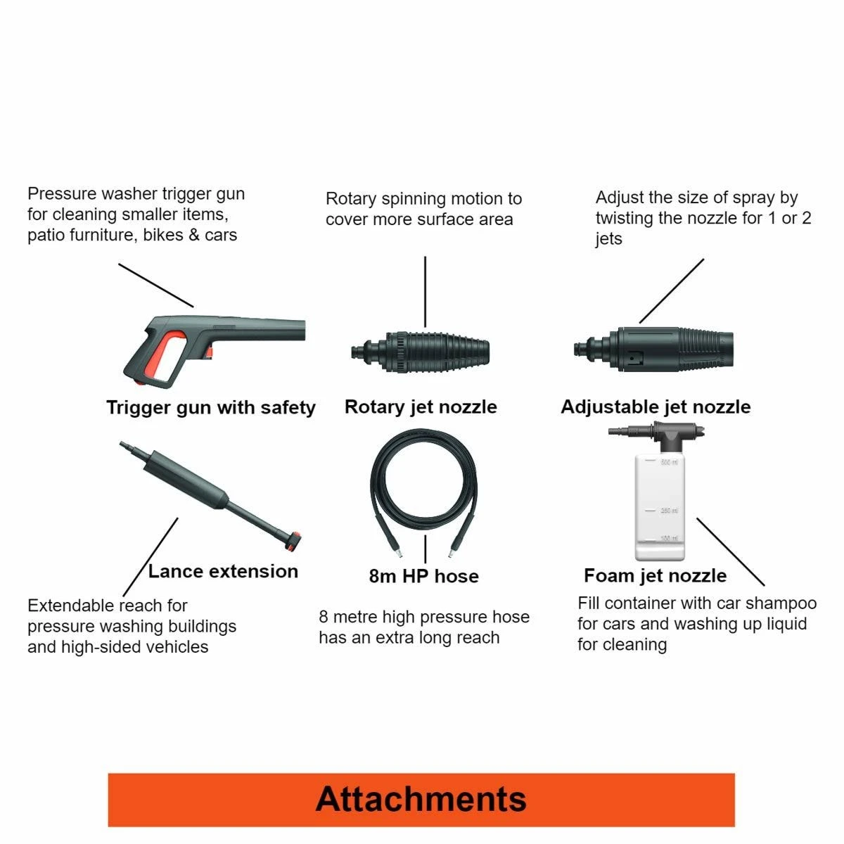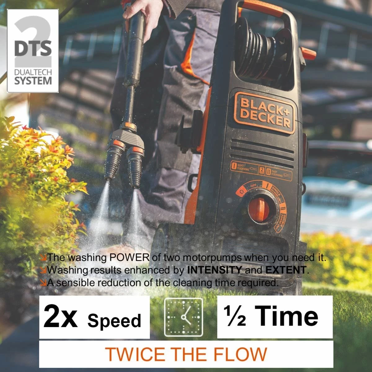 The new Black and Decker 2500DTS E Pressure Washer Cleaning Kit is unbeatable for cleaning many outdoor household surfaces and for washing cars, bikes, tools and garden furniture.