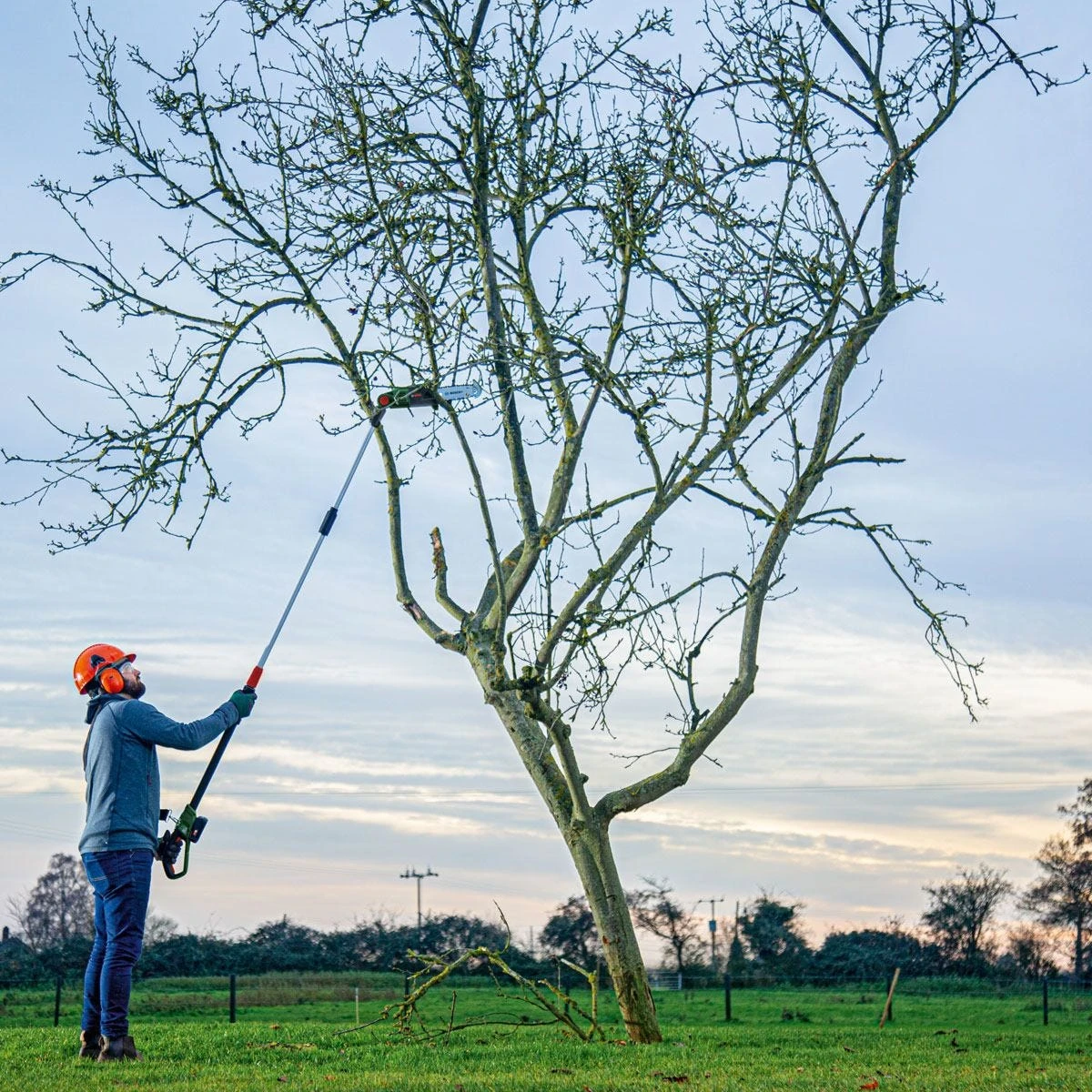 Prune tree branches from ground level effortlessly without using a ladder. The UniversalChainpole 18 enables easy pruning in otherwise unreachable areas with the telescopic pole and pivoting head. The well-balanced, lightweight, ergonomic design minimises strain on arms and shoulders while the tip protector and bumper spike offer maximum control while cutting and undercutting. The automatic chain lubrication and an oil level indicator ensure the tool runs smoothly for consistent results. Use the cordless Universal Chainpole 18 for continuous cutting without damaging trees.