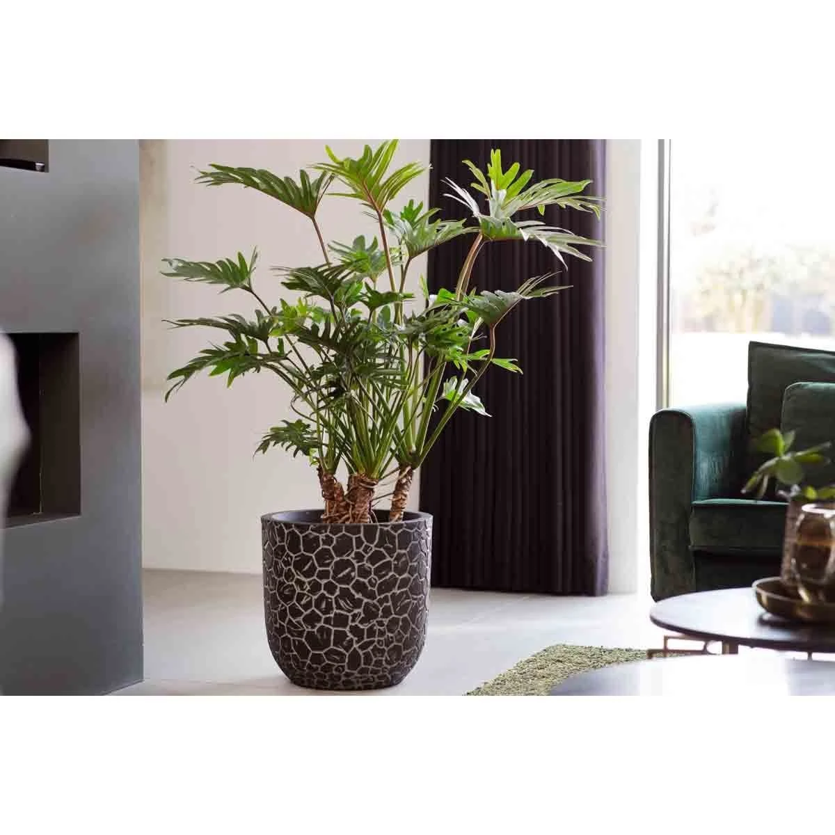 This sustainable planter out of the Clay collection is made with recycled materials and is suitable for indoor and outdoor use. The orange inside of the planter is intended to represent their place of origin and it also provides the planters with insulation, offering your plants extra protection against both heat in summer and cold in winter. This extra layer provides extra firmness to the planter, which makes it fracture-resistant. In addition, the flower pot has a lifetime guarantee.The Clay-texture gives these planters a tough, natural look. This texture is inspired by cracked clay soil. It shows the process of nature where solid clay dries out and cracks. One of natures many forms. The planter is perfect for indoor use, because the planters are 100% watertight. For outdoor use you only have to drill a drainage hole with a minimum of 25 mm.