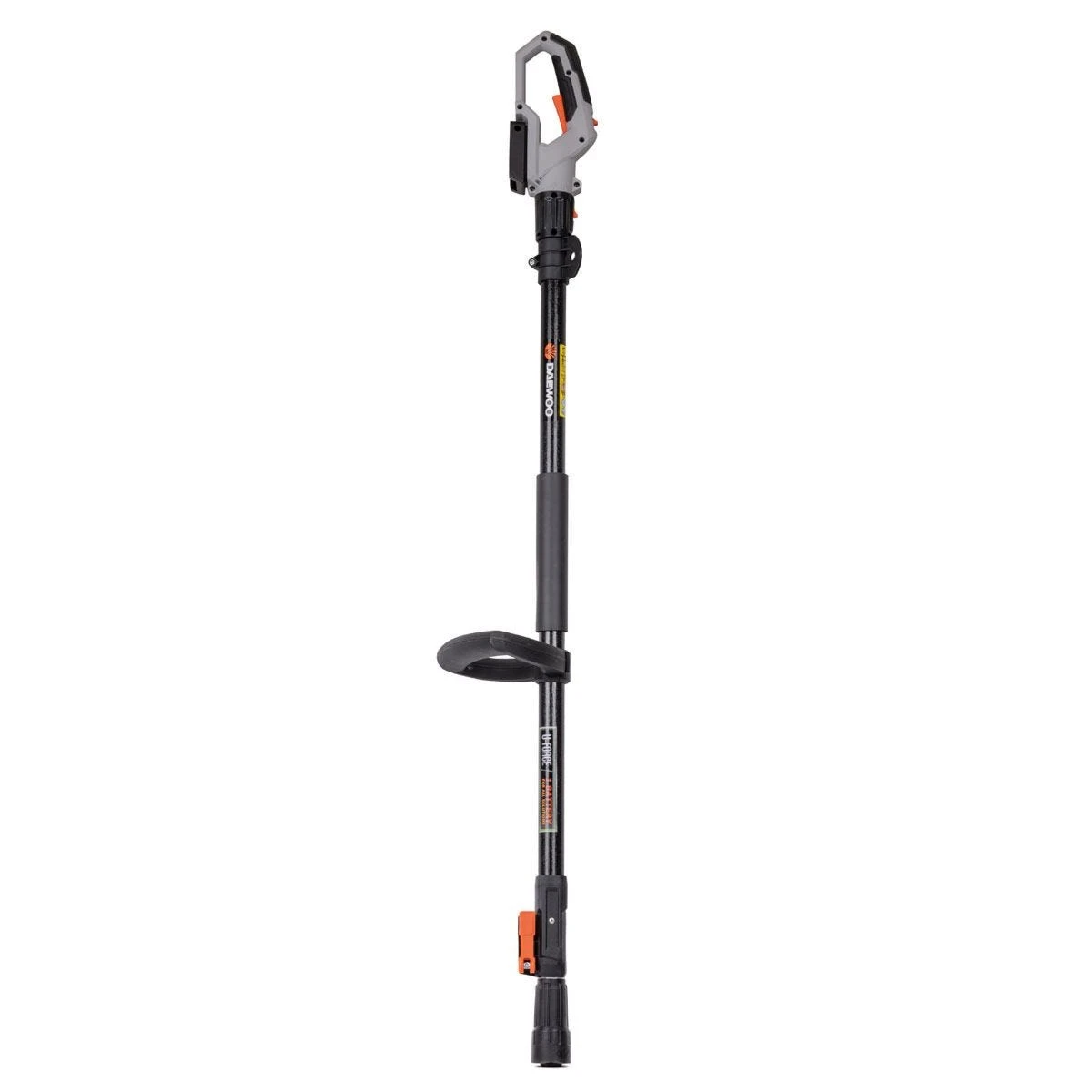 As a result of DAEWOO Korean technology and engineering, this handful tool has a powerful 18V motor, which provides 3,000 rpm, translated to 5.5 m/s speed on the chain bar. The device weighs only 3.7kg, without battery. The 200mm long chain bar is removable, the chain is replaceable and can be easily adjusted with the tension screw. The head can be set to 30-60-90 degree angles. The adjustable pole allows lengths from 1.9 to 2.7m. It is conveniently working through up to 100mm thick branches or any other wood materials.