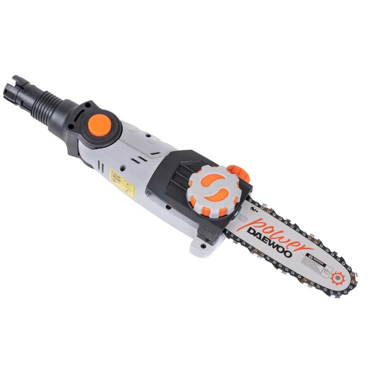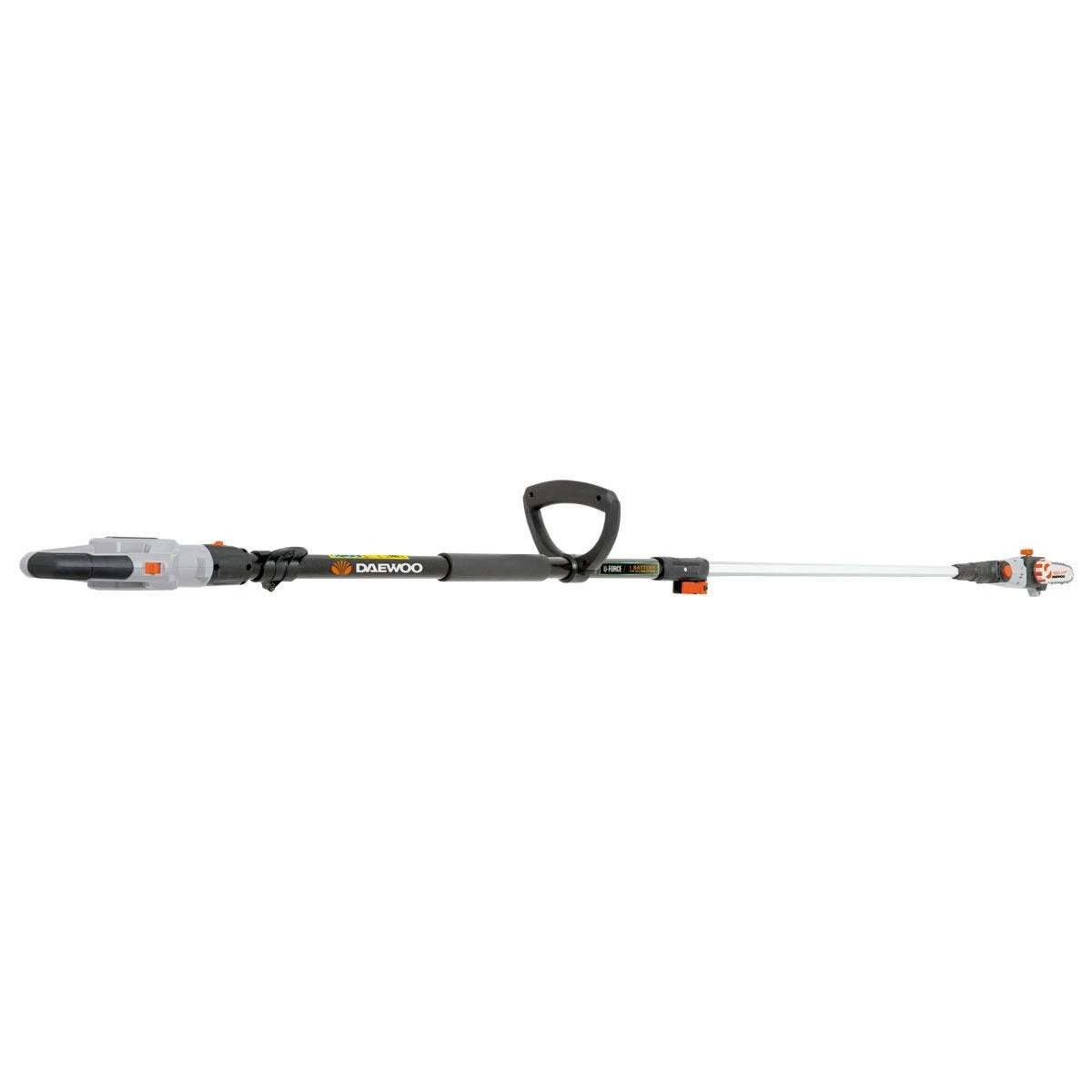 The cordless pole chainsaw is a battery-operated device, part of DAEWOO’s U-Force interchangeable battery family, ‘One battery for all’ system.