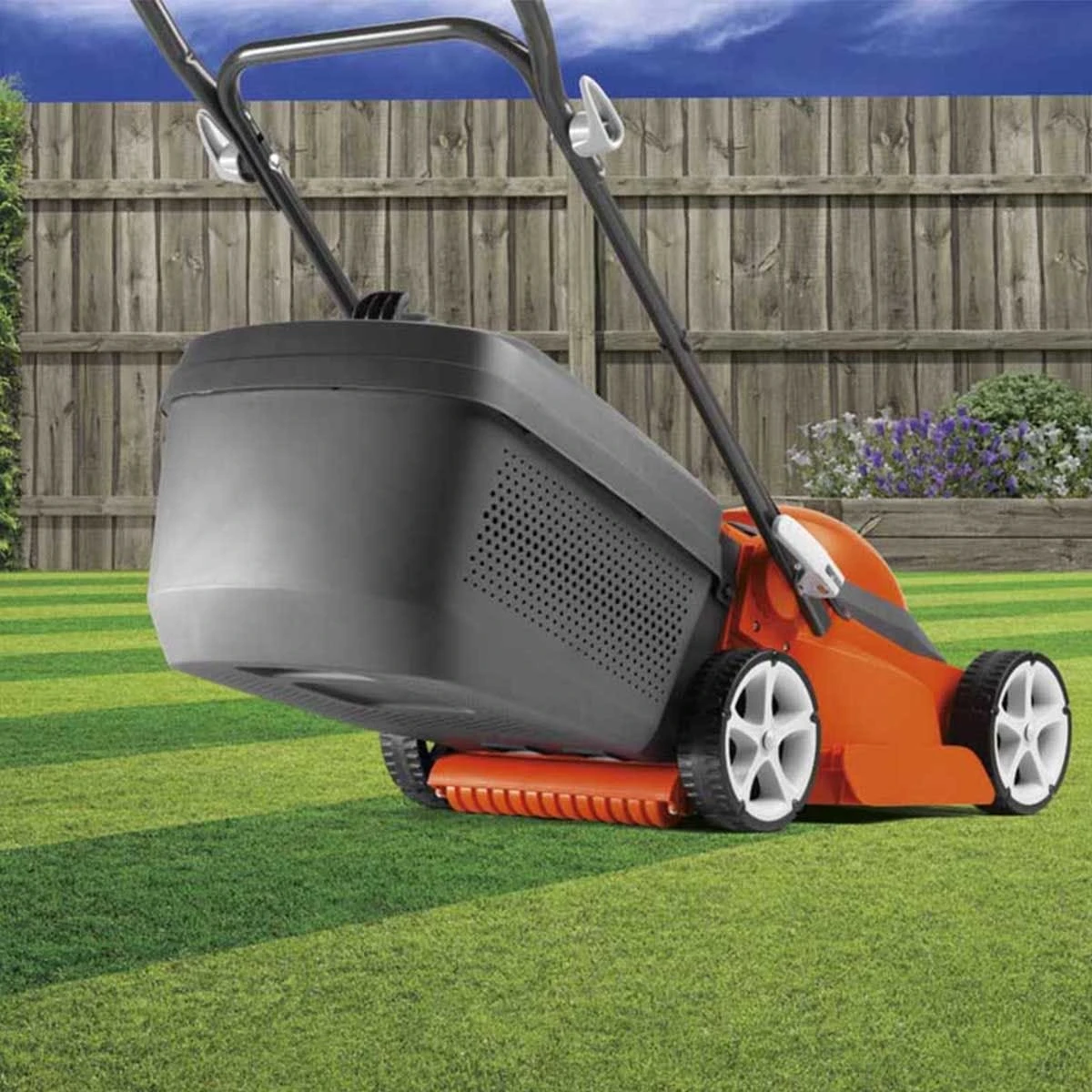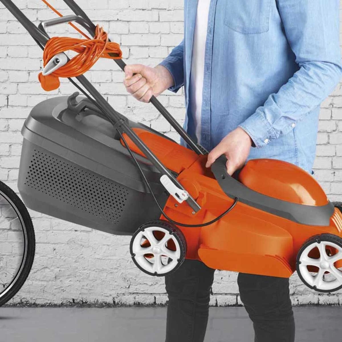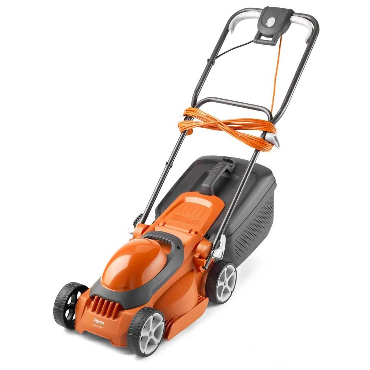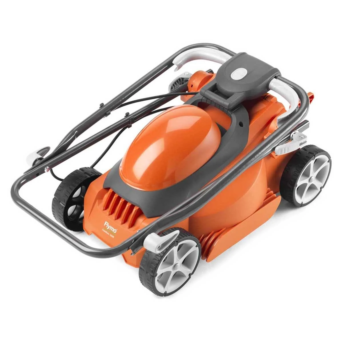 Designed for medium to large gardens, the Flymo EasiStore is a 30cm electric wheeled rotary lawnmower with a powerful motor. Equipped with central height adjust, a large easy to empty grassbox and dual lever handles.