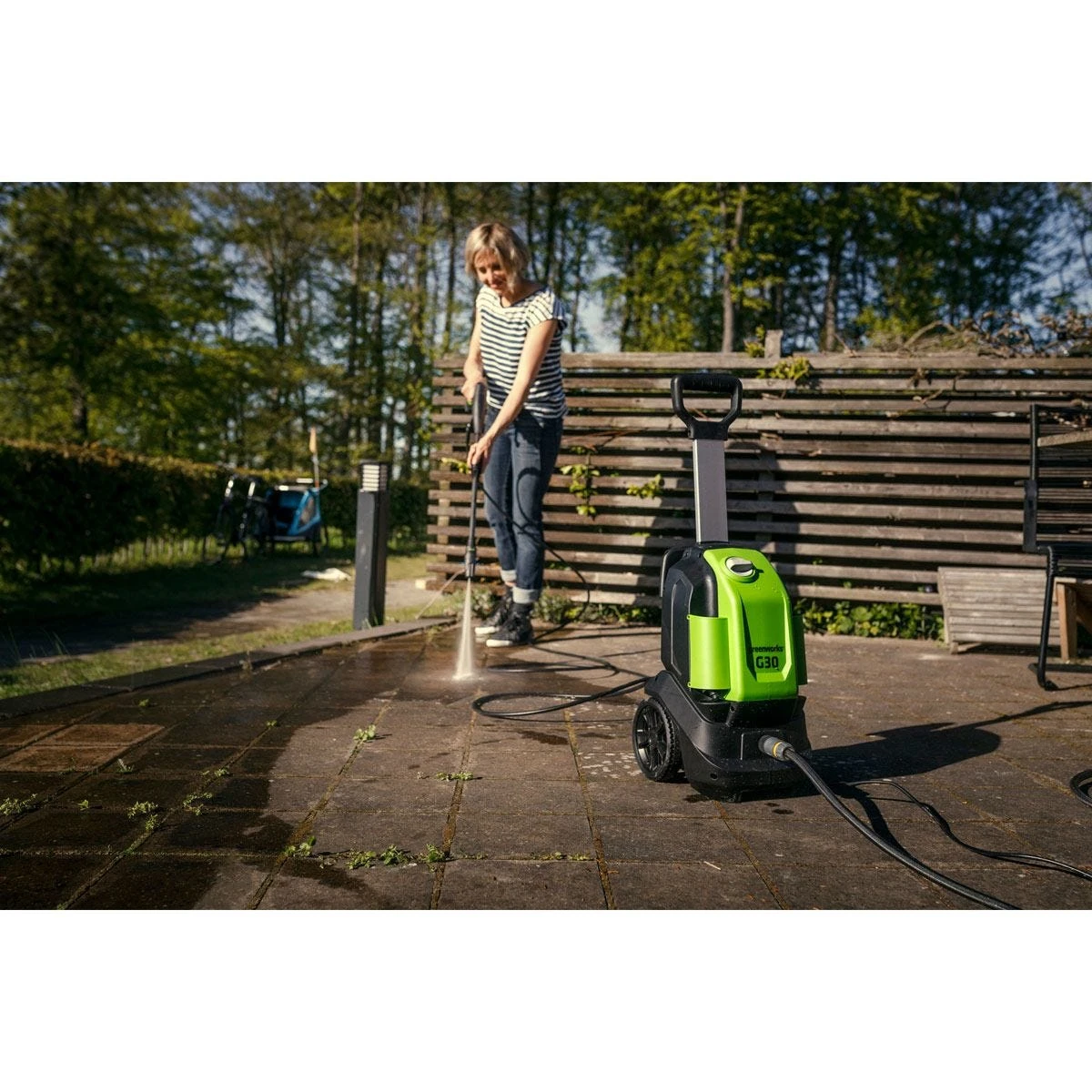 The Greenworks G30 is a fantastic addition to your garden power equipment. The powerful 1500w motor delivers an impressive 120 Bar of pressure, meaning no cleaning task is to tough. Whether it be cleaning cars, bikes, patios, decking, brickwork or windows the G30 gives you the ultimate control. The vario power nozzle and turbo nozzle allows the user to find the right pressure for optimal cleaning whatever the task. The G30 is supplied with a foam sprayer, add your chosen pressure washer detergent to cover your work area in a viscous foam to aid the breakdown of dirt.The 6 metre hose gives you that freedom to comfortably move around your outdoor areas, leaving the machine in a stationary position. The onboard accessory storage makes packing away your G30 quick, simple and compact.The G30 has it all with wheels and e trolley handle further improving user comfort and manoeuvrability.