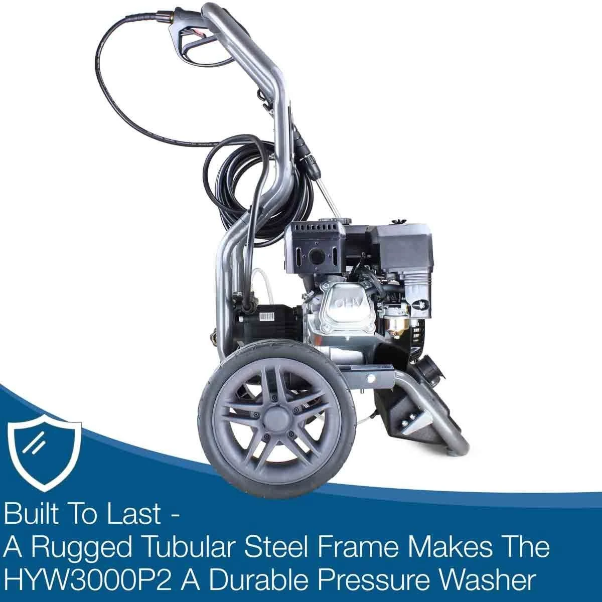 The HYW3000P2 delivers 2800psi pressure and a flow rate of 8.75L/min from its triple stainless steel pistons high-pressure pump, for quick, easy and effective cleaning of driveways, patios, vehicles, windows, and other demanding jobs where a high power washer is needed.
