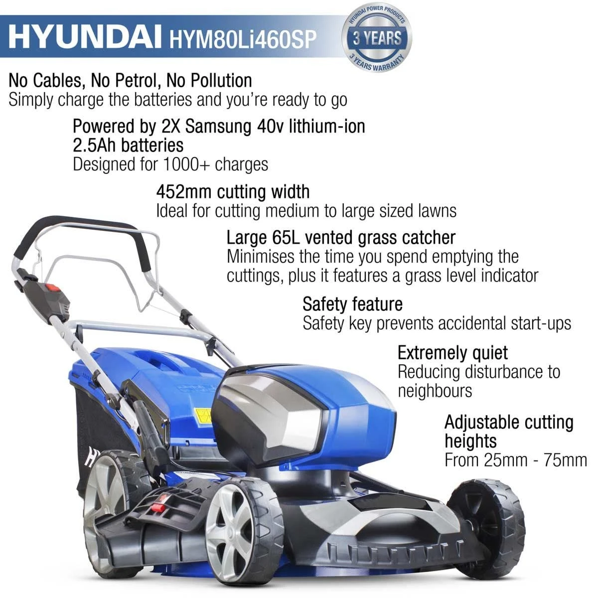 No cables, no petrol and no pollution, the HYM80LI460SP lawn mower is powered by the market leading Samsung 40v Lithium-ion 2.5Ah batteries (2 included), no more messy fuel or dangerous mains cables.