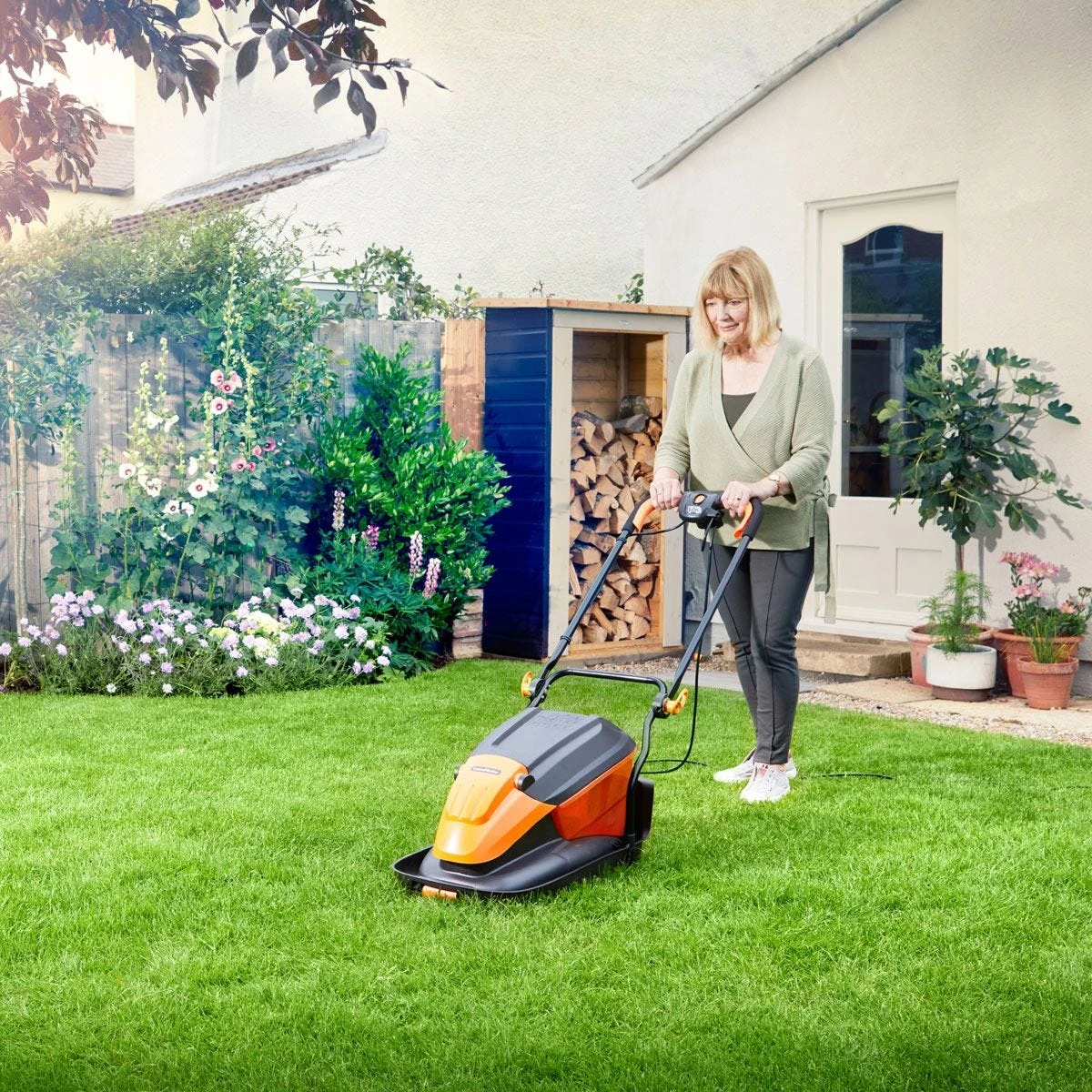 - Folding handles give a compact footprint, and the front transport roller makes it easy to move the mower to the lawn and in and out of tight spaces such as the garage or shed