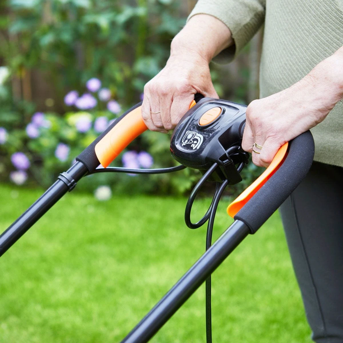 - The integrated cable hooks allow the long 10m power cable to be stored easily on the mower