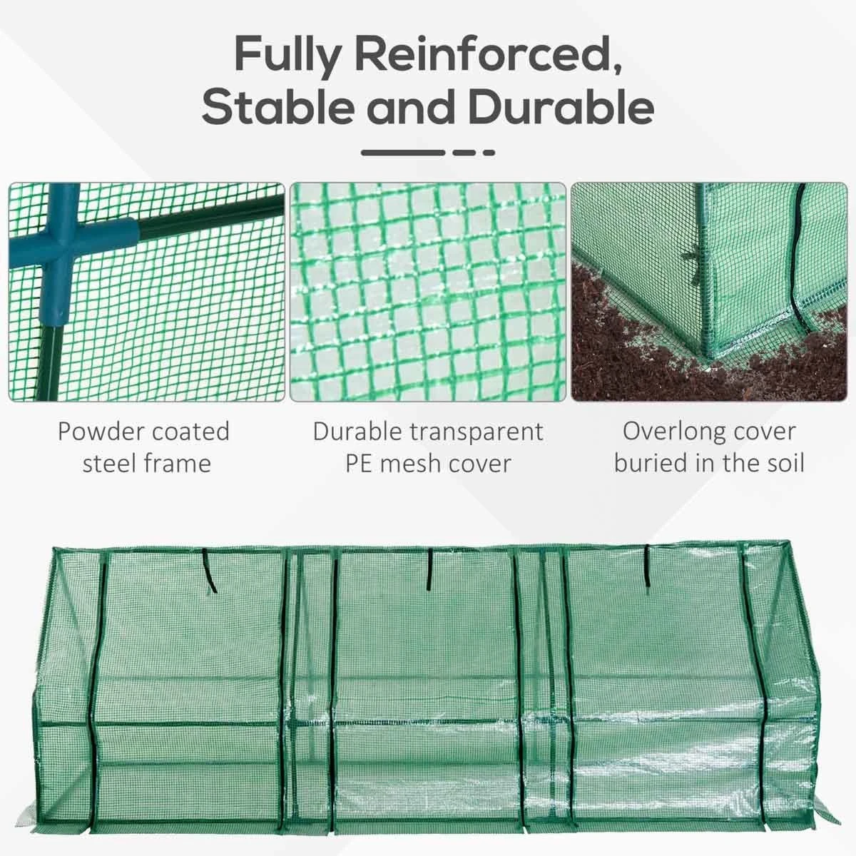 Using powder coated steel for strength and reliability all year round, the frame is crafted into a low and wide design, making it great for fitting into smaller spots. It features a UV-resistant cover, helping to protect plants in all weather conditions whilst providing plenty of sunlight for them to nourish and grow. The cover also features two roll-up zipped doors, providing easy access and ventilation throughout.