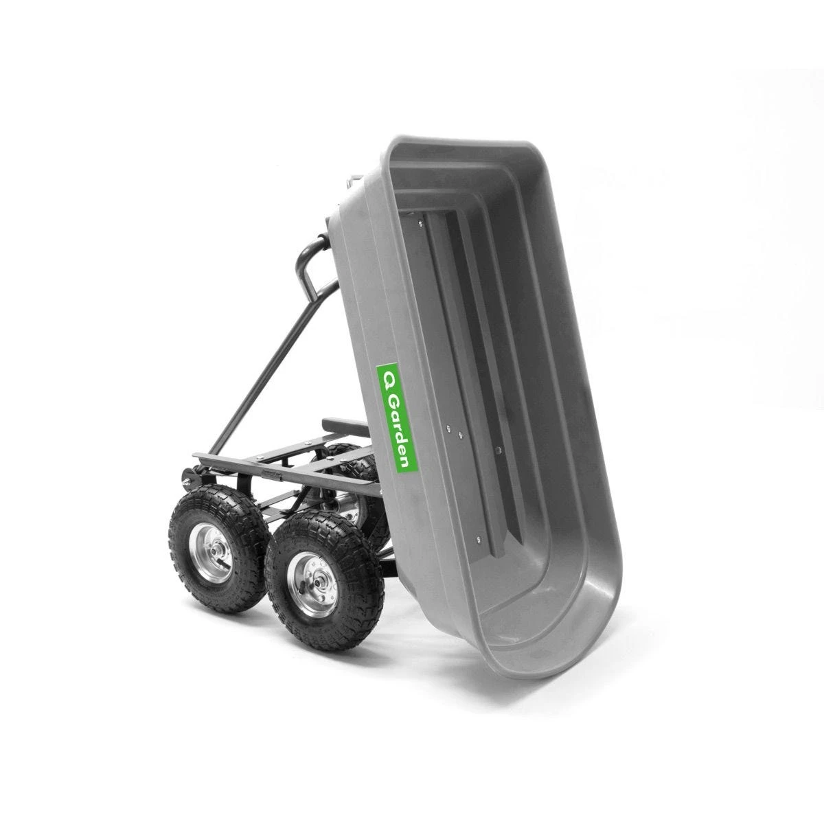 The attractively priced QGPGC garden dump cart features a corrosion-resistant poly body and offers easy manoeuvrability thanks to its turntable steering and sizeable pneumatic tyres. It boasts a generous 150kg capacity and features a convenient tipping system. The Q Garden QGPGC has been equipped with a dual-purpose handle – it can either be pushed or pulled. It features an impact-resistant polycarbonate bed that’s easy to clean and which will never rust; and it employs a turntable-type steering system that ensures it excels in terms of manoeuvrability. Thanks to its widely-spaced wheels and low stance, the Poly Body Garden-Cart will stay safely stable when being used on rough or rolling ground. Large, wide-profile tyres mean it can be guided across lawn-areas without damaging the turf; while an ingenious tipping-mechanism – whereby the back wheels move under the cart – makes it possible to deposit the load exactly where you want it. This model has an impressive 150kg capacity.
