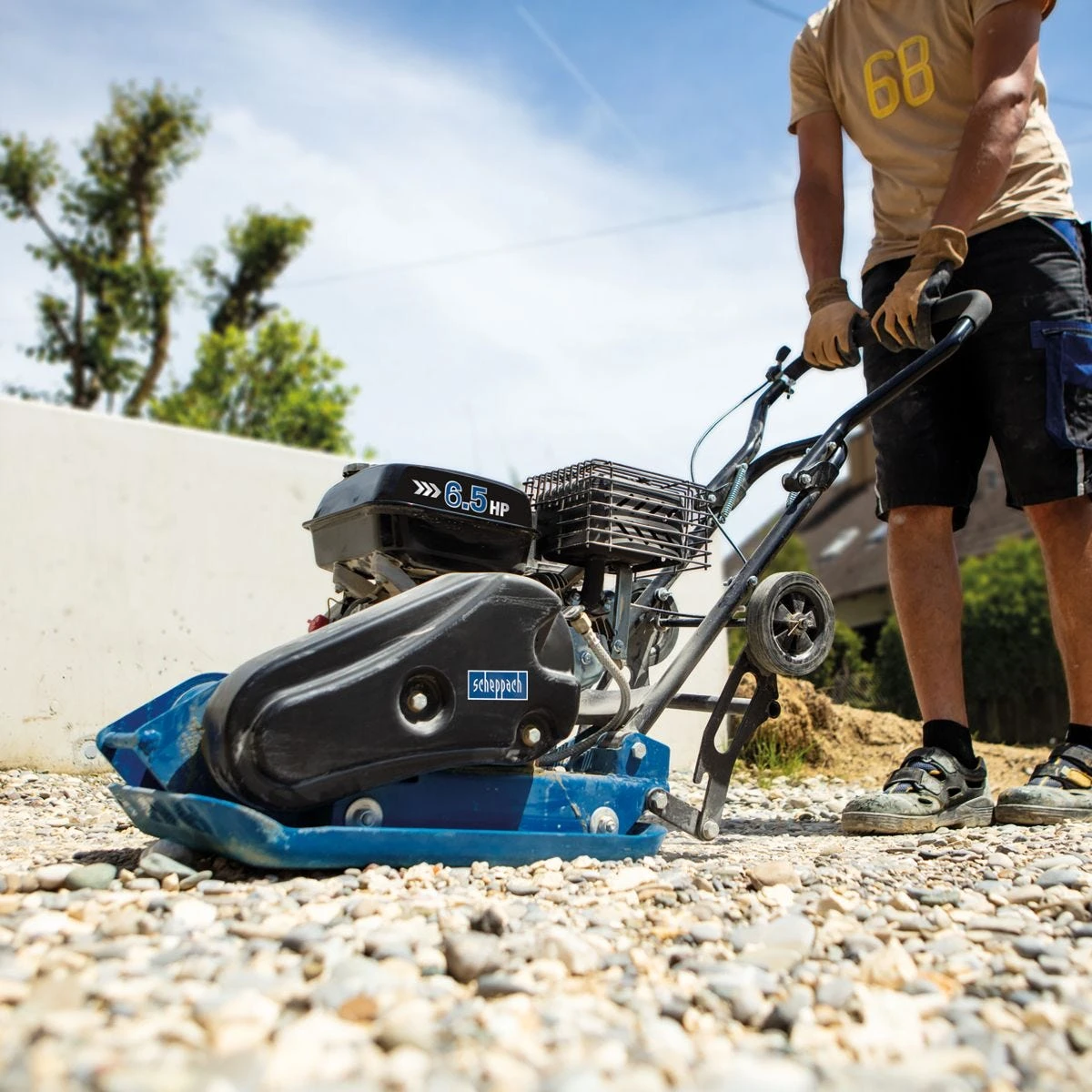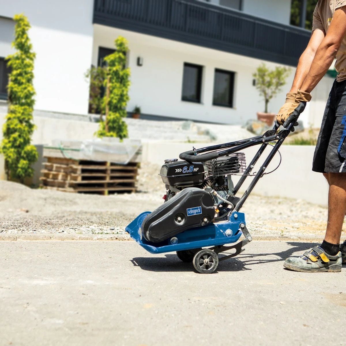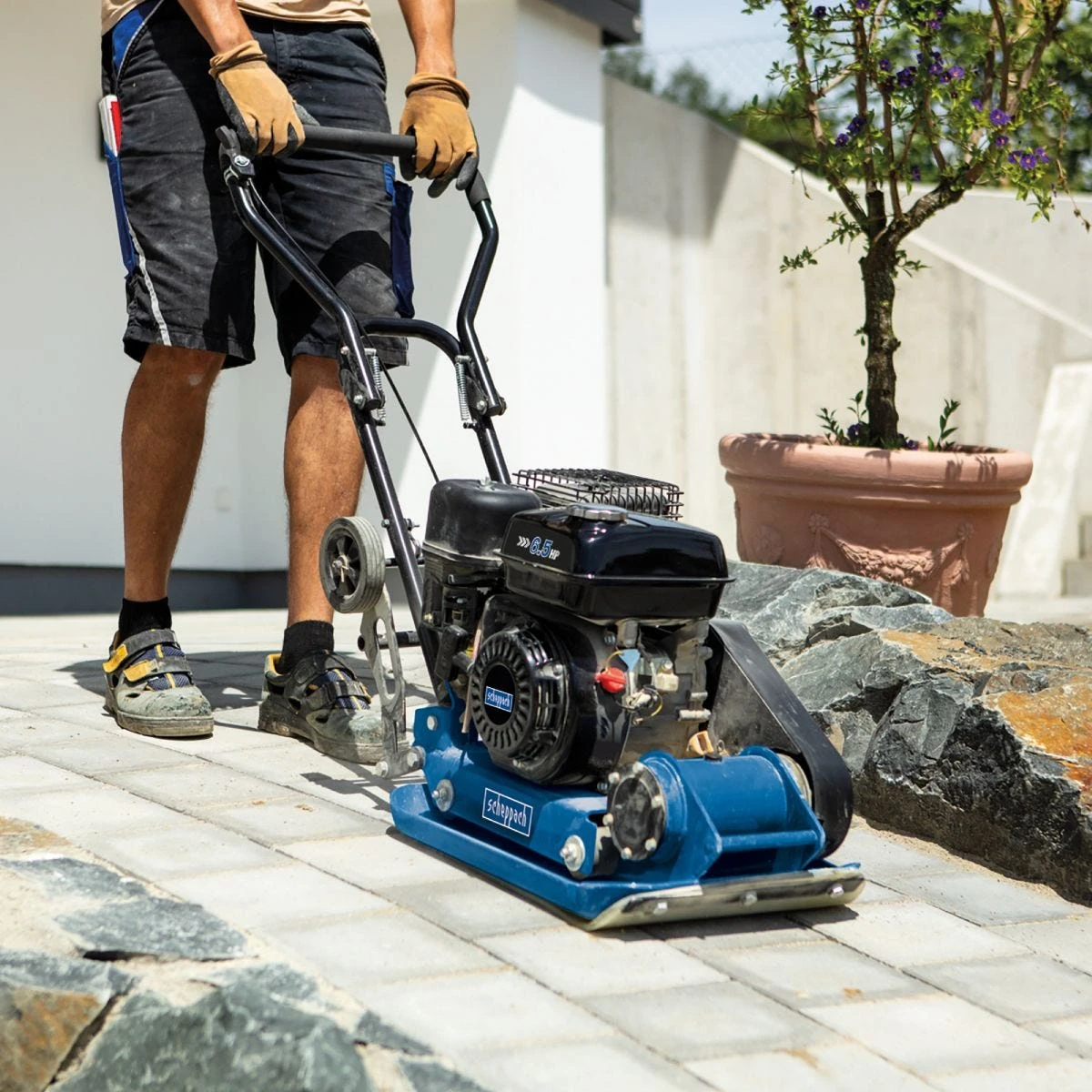The Scheppach HP1300S is a heavy duty petrol plate compactor which delivers performance and good compaction force from this mid–sized semi–professional machine. It features a reliable 6.5 HP petrol engine and delivers 13000 N compaction force to a depth of 30 cm. The ideal machine for independent building contractors and landscapers wanting a more powerful machine to handle heavier workloads and larger projects including patios, house extensions, paths and drives, and large gardens.