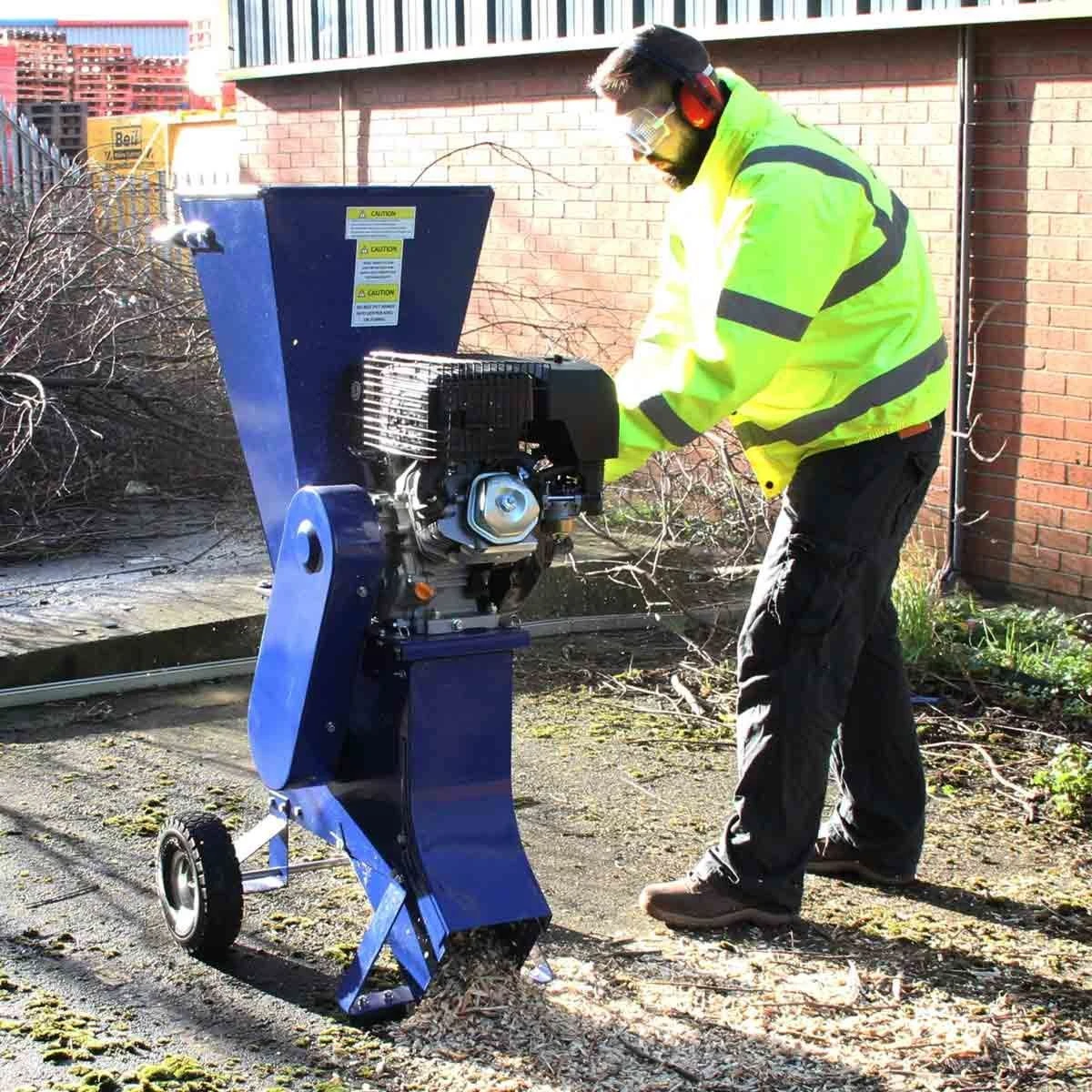 - Equipped with wheels, this wood chipper is fully portable and you can move it around your garden with ease. The free personal protection equipment (PPE) should be worn at all times when operating the machine