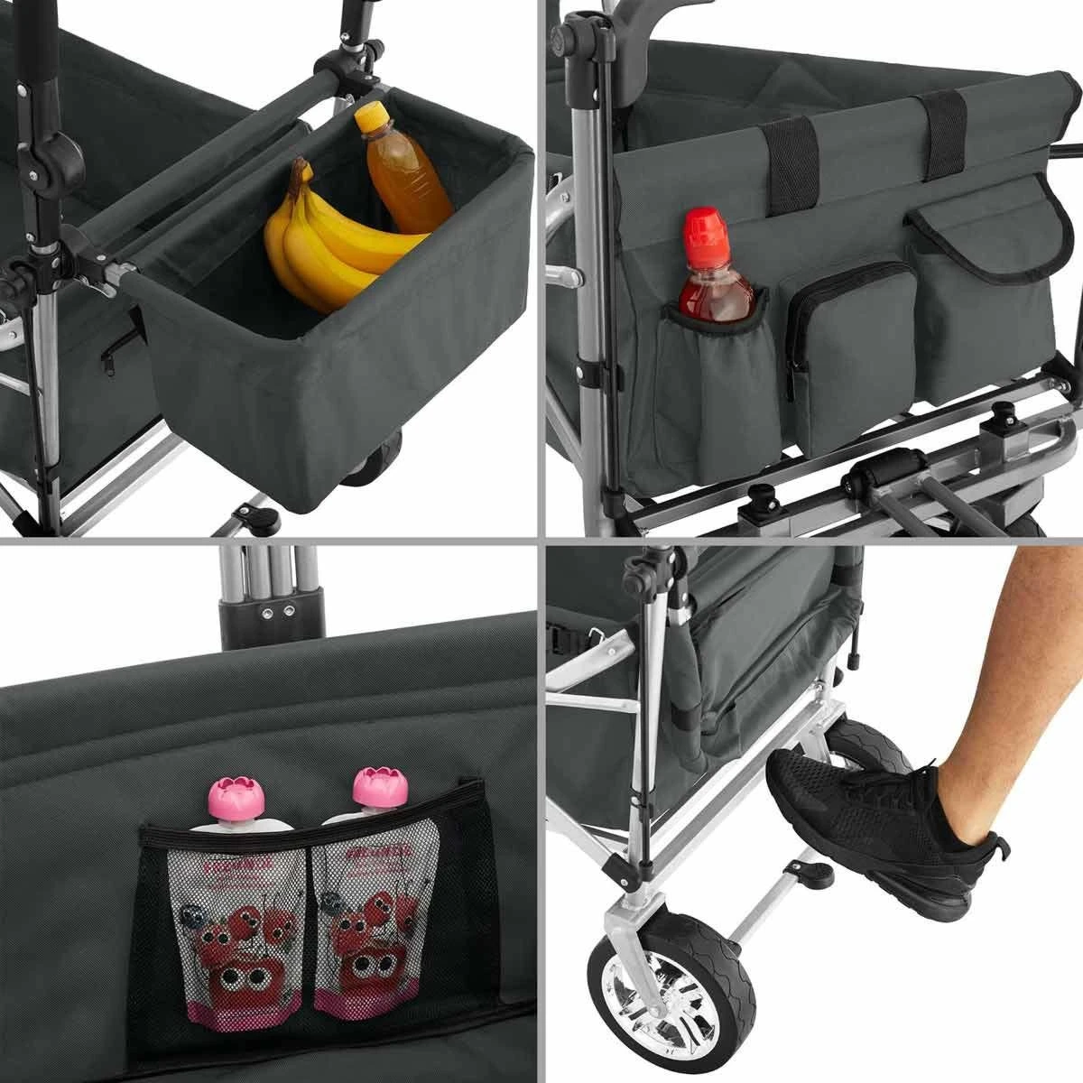 Lots of storage options and a removable roof are just some of the many highlights offered by this functional handcart Trolley from Tektake. The clever folding Mechanism means this transport cart is always ready to go. The removable tongue, adjustable handle and smooth plastic wheels with grip make pulling and manoeuvring a breeze. The sturdy steel frame and durable polyester fabric guarantee good durability, resistance to water and dirt as well as a long life – for use around the home, garden, on adventurous family trips or at exciting festivals.