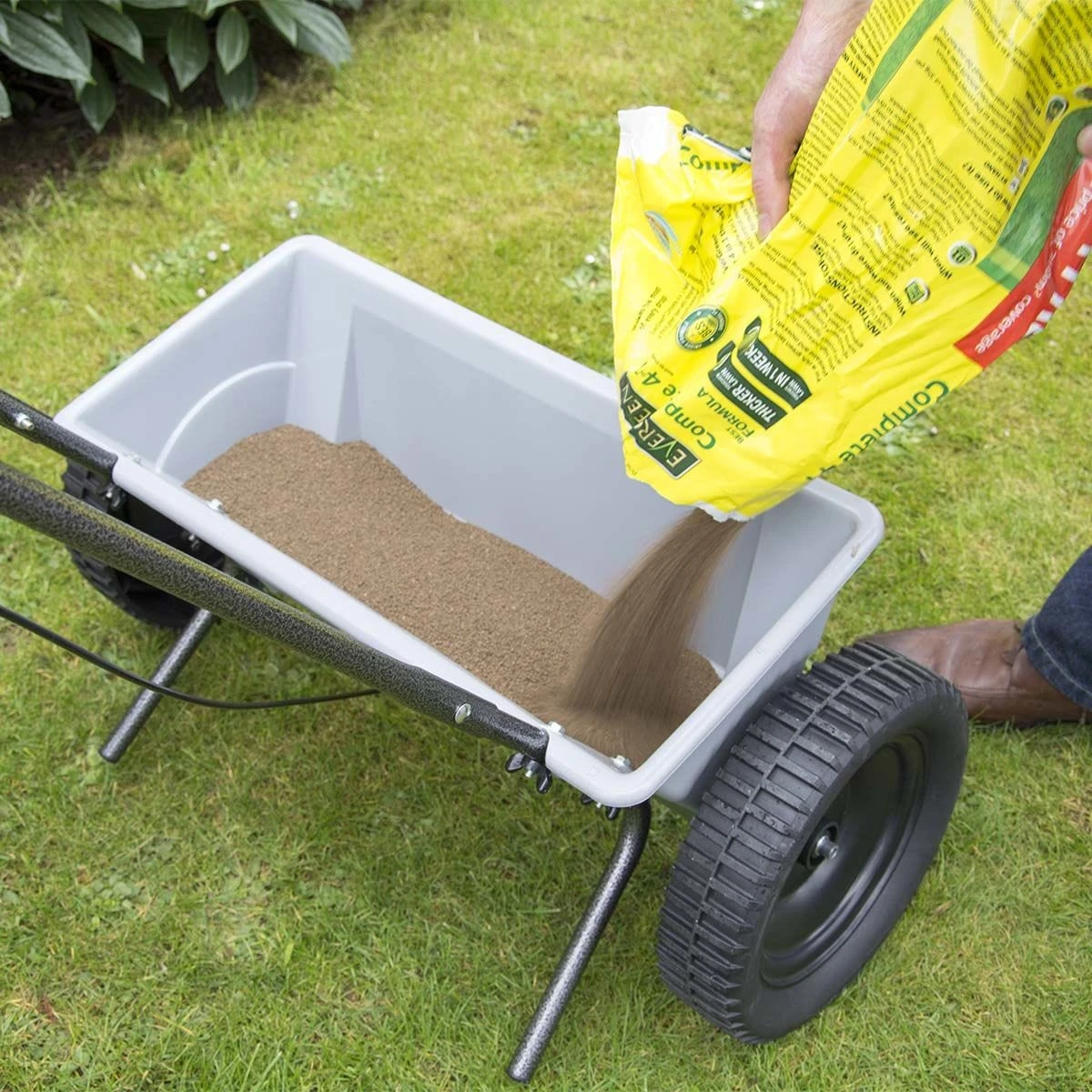 Features include a rust and weatherproof poly hopper; adjustable feed control for flexibility of use; and fingertip control for comfortable use. Its lightweight design and large, free-rolling wheels make it easy to propel, even on rough ground; while its convenient handlebar-mounted spreader-gate control spares your back by eliminating the need to repeatedly bend down.