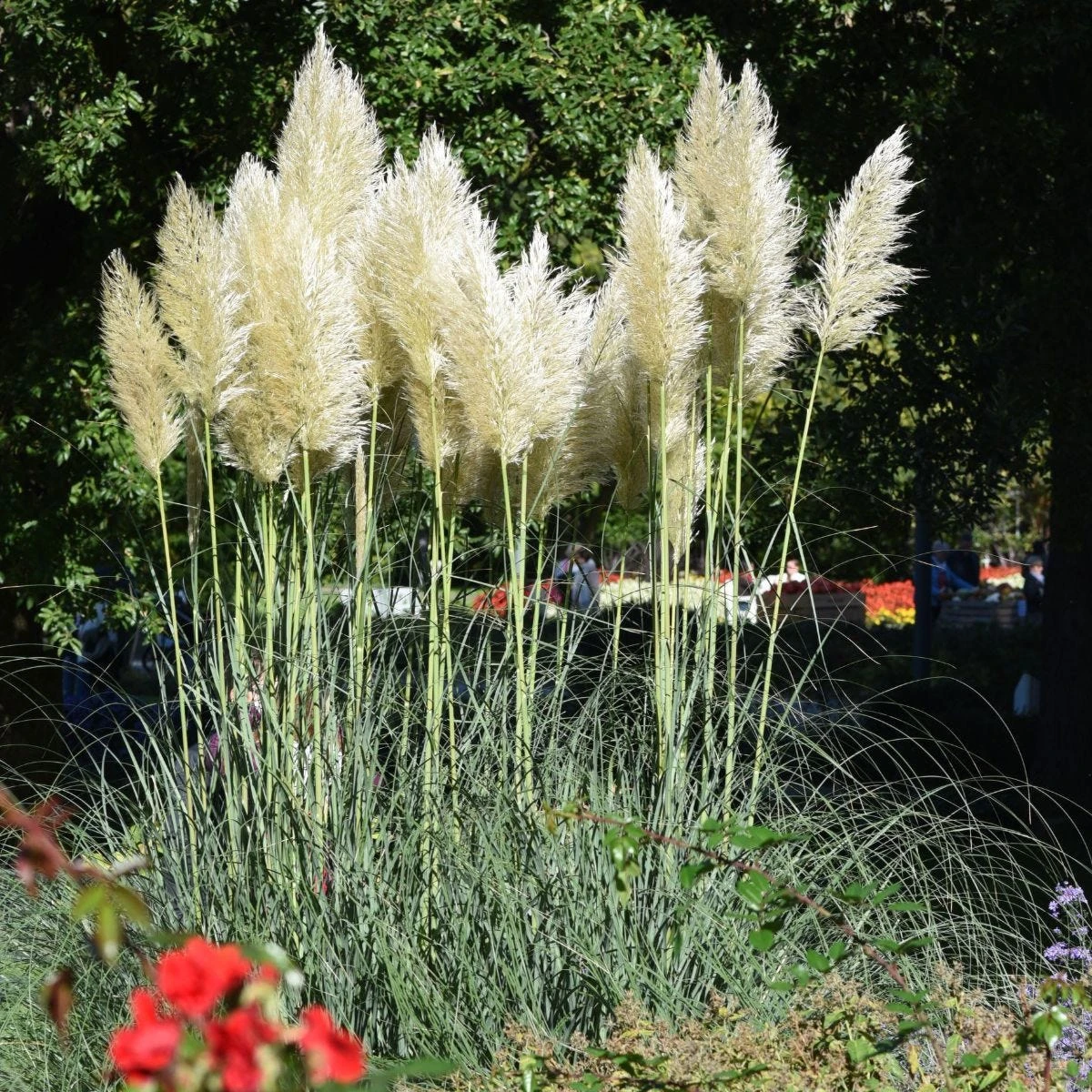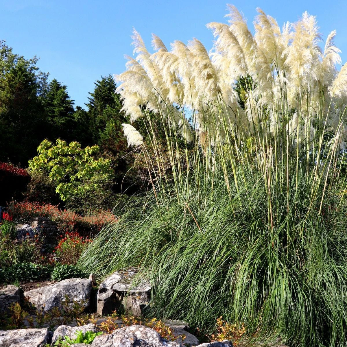 Cortaderia selloana ‘White’, also known as Pampas Grass, is a hardy perennial that adds a touch of drama to any garden. With tall, sturdy stalks adorned with stunning plumes of feathery, white seed heads, this plant is a standout specimen. Pampas Grass is incredibly low-maintenance, requiring minimal care while providing year-round interest in the garden. It thrives in full sun and its tufted evergreen foliage adds texture and beauty to any landscape. With a height of up to 150cm and a spread of up to 120cm, it is a versatile choice for borders and smaller gardens.