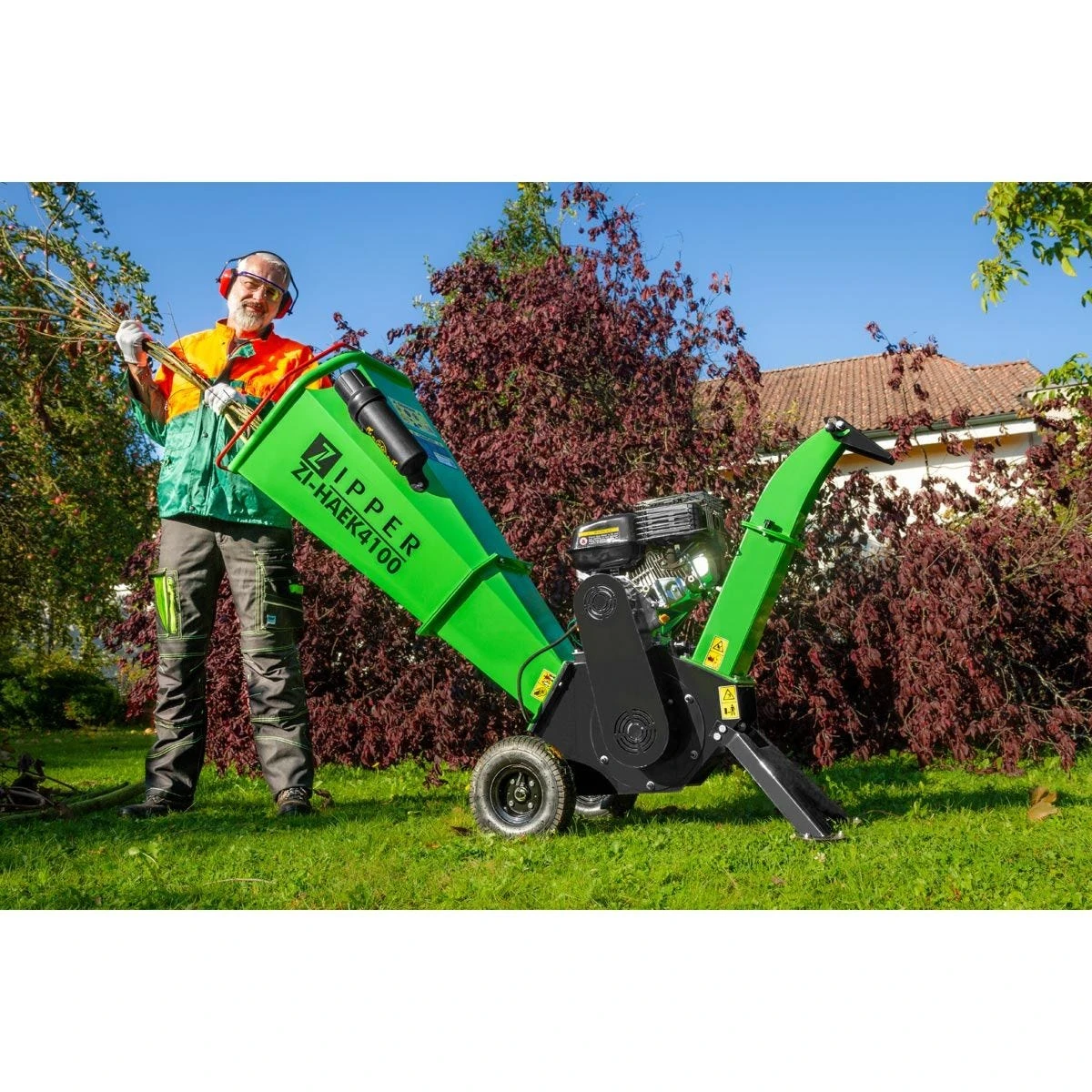 Powerful petrol wood chipper with 5.4 hp 4-Stroke engine for reliable crushing and disposal of branch like material and logs up to max. 100 mm Ø. Powerful Zipper petrol wood chipper for efficient and reliable crushing of all raw garden materials and branches.